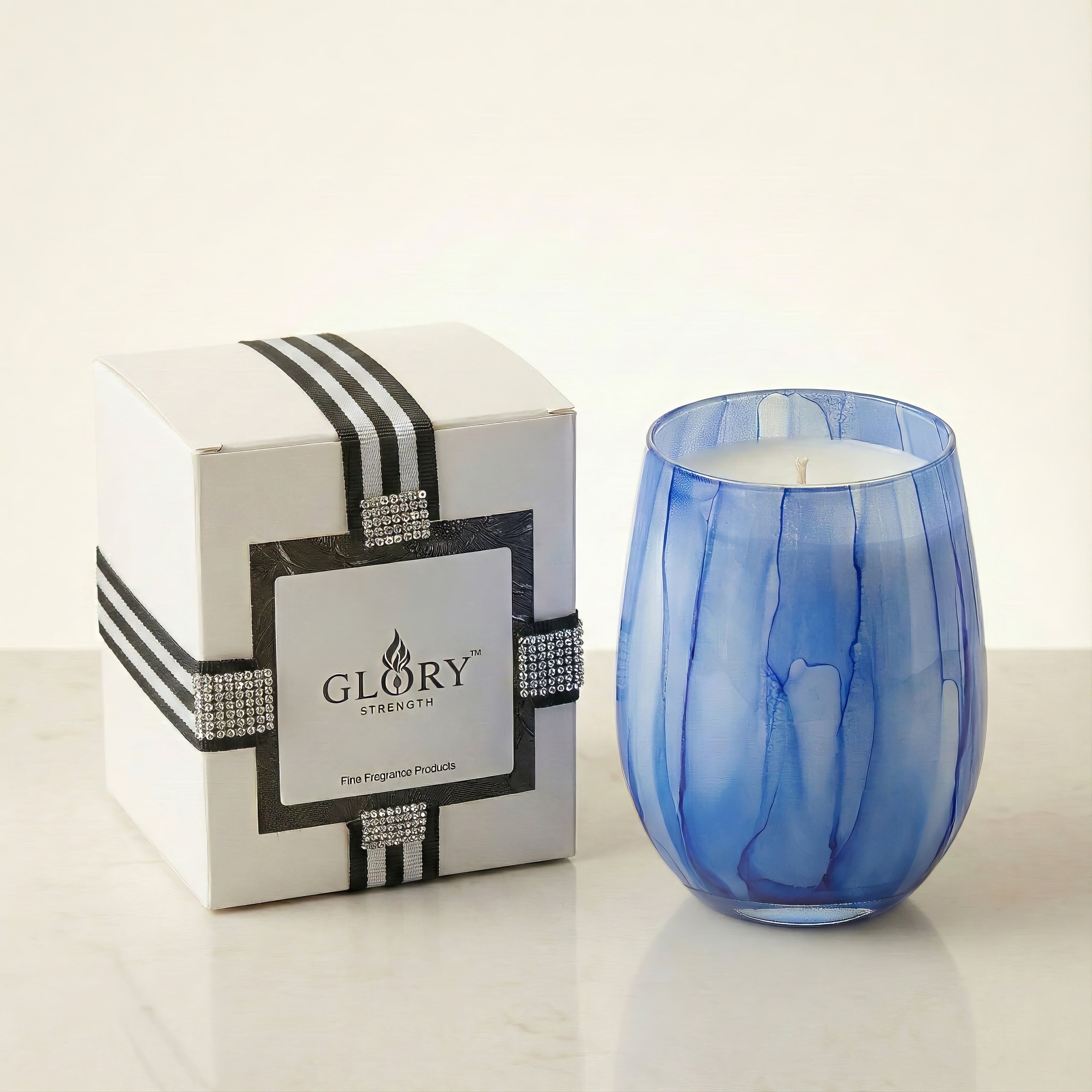 Elegant Whisper Feng Shui metal element luxury candle in white-to-smoke ombré glass vessel with GLORY STRENGTH gift box