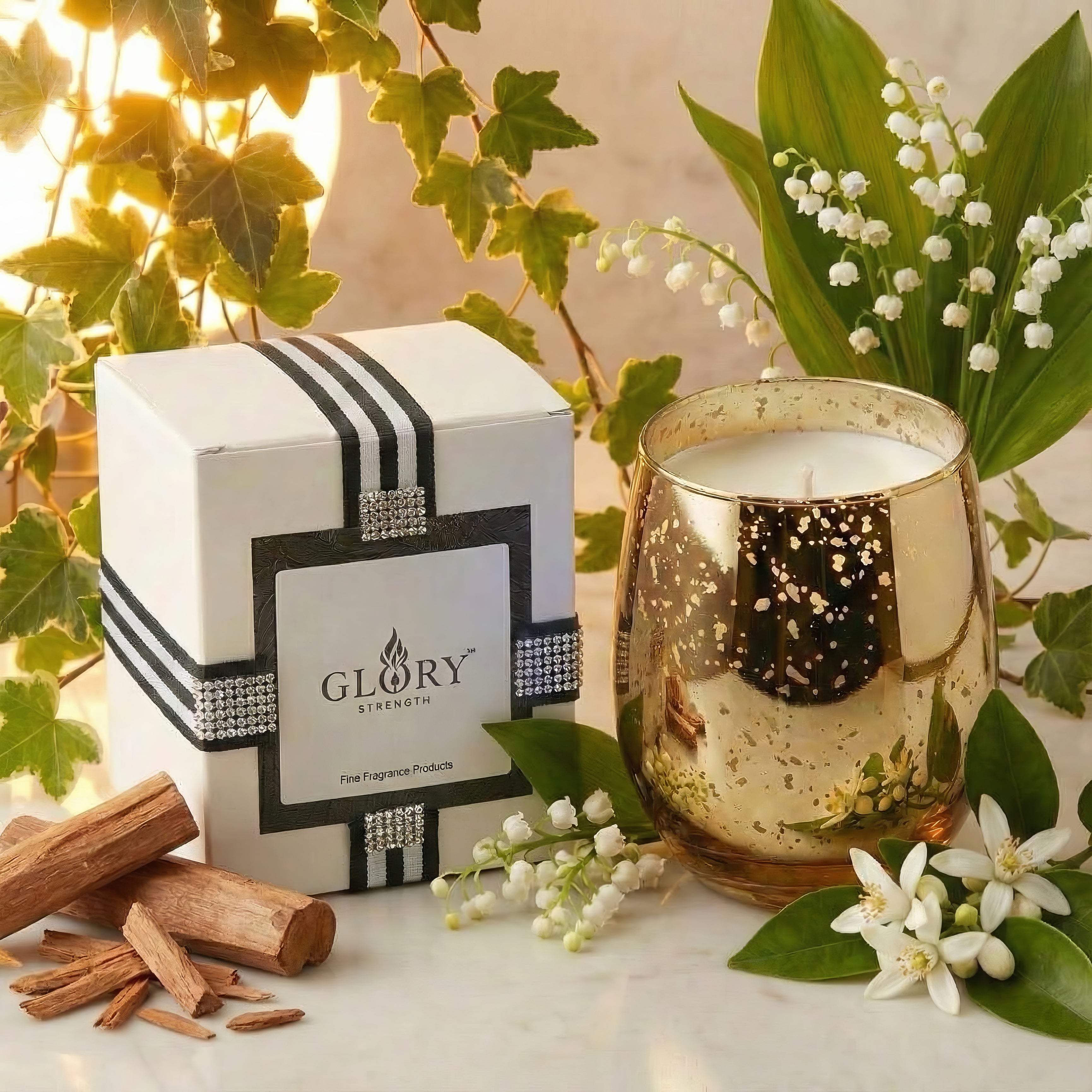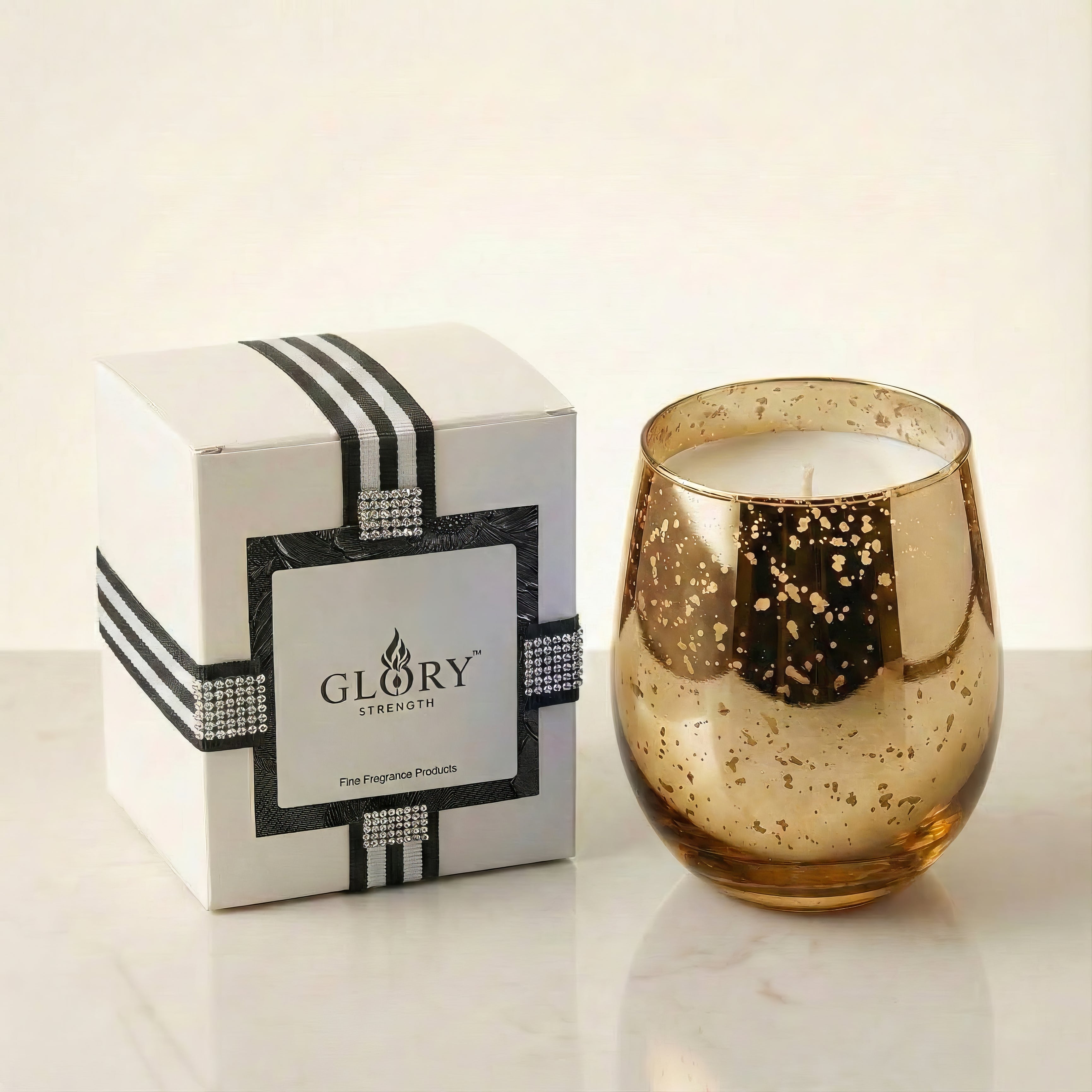 Legacy Collection Today flagship luxury candle in antique silver mercury glass vessel with GLORY STRENGTH gift box